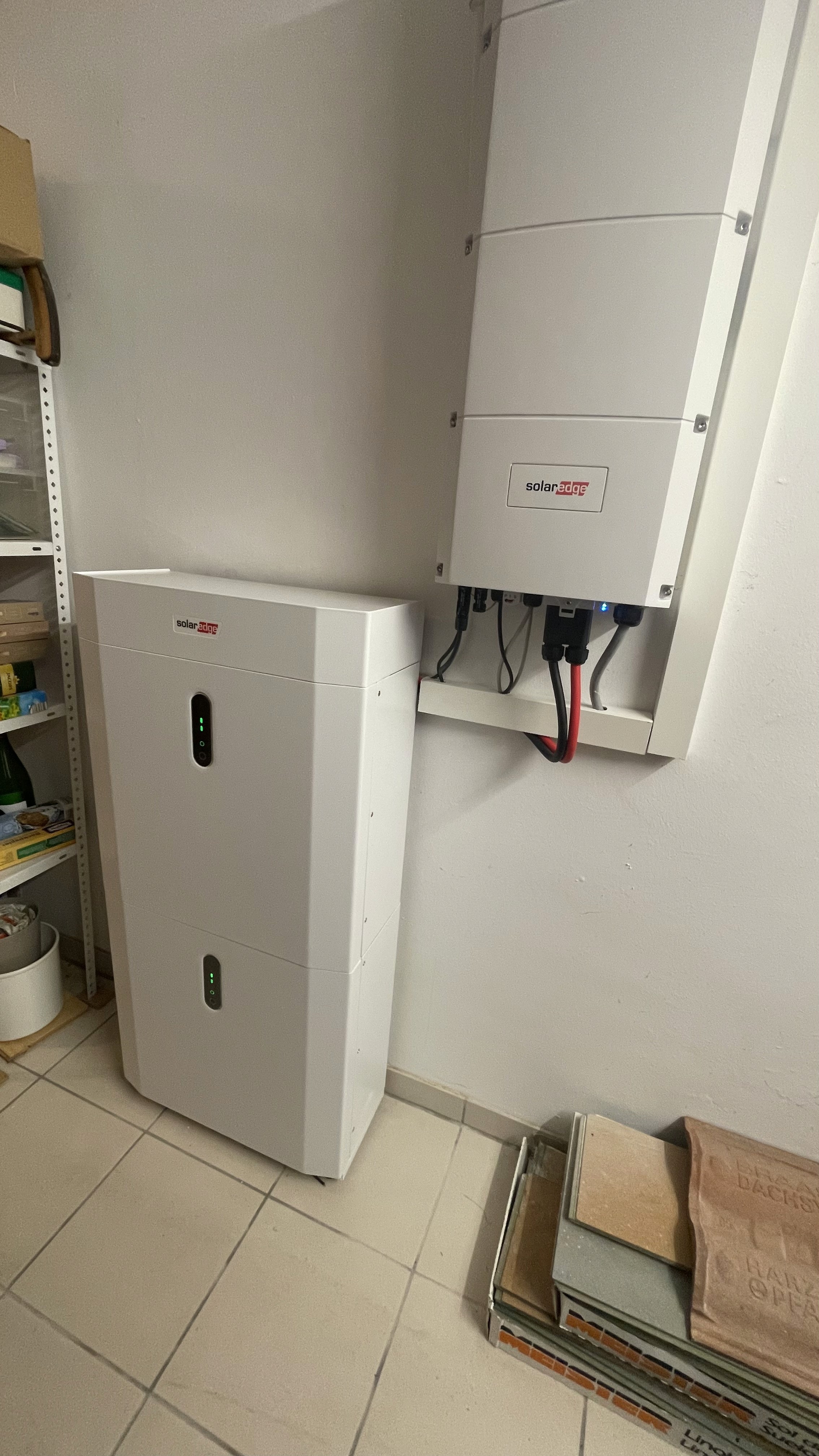 Eine saubere und effiziente Anlage, die moderne Solartechnik verkörpert. Herzstück ist ein Hybrid-Wechselrichter in einem neutralen Gehäuse, der präzise installiert und durch Schutzkomponenten für zusätzliche Sicherheit unterstützt wird. Strukturierte Verkabelung sichert das System, ergänzt durch einen übersichtlich angeordneten Verteilerkasten, der Übersichtlichkeit und Zuverlässigkeit unterstreicht.