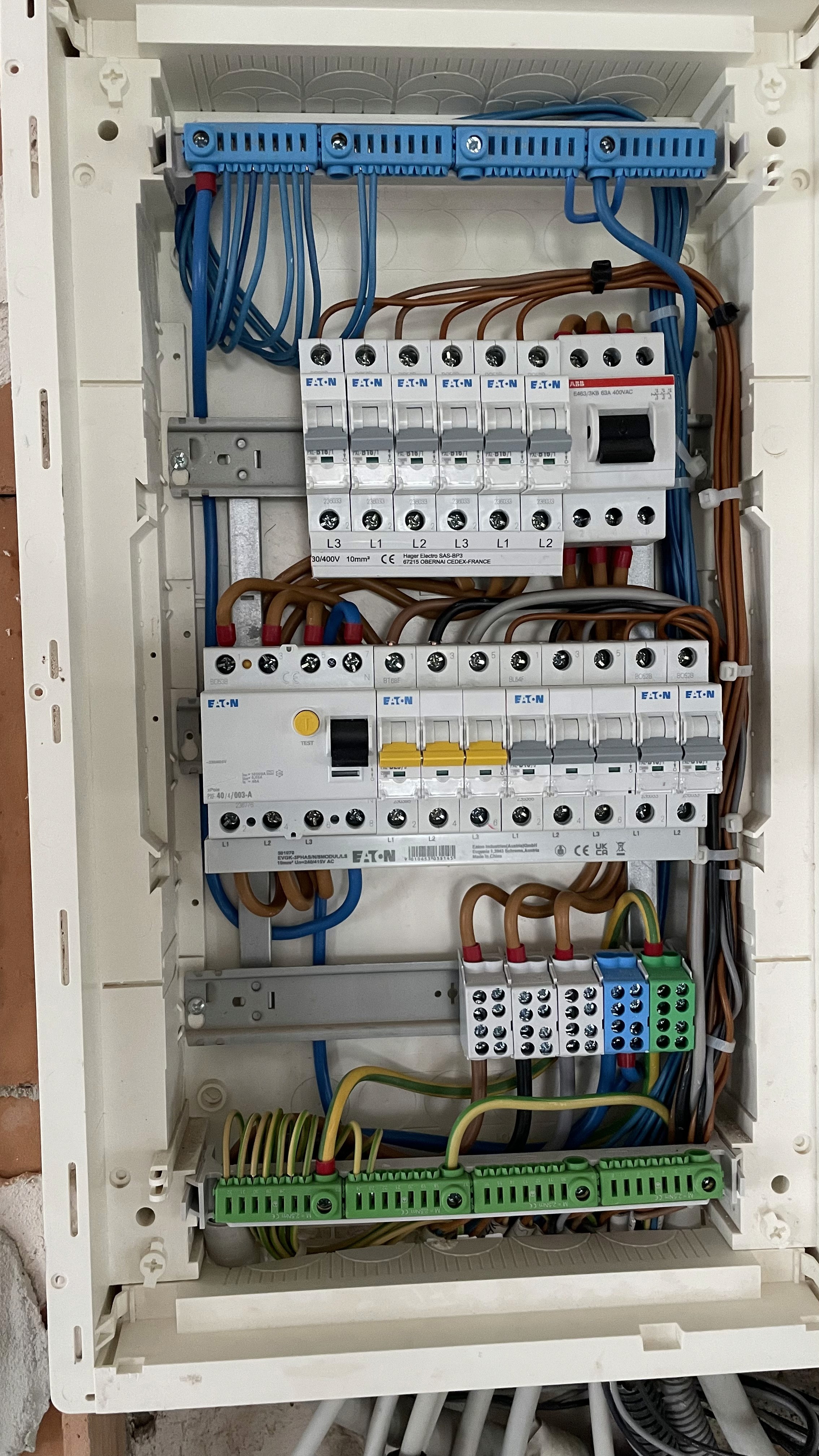 Ein übersichtlicher Mittelpunkt, der Sicherheit und Kontrolle in den Vordergrund stellt. Der modernisierte Schrank, ausgestattet mit Überspannungsschutz und modernen Leistungsschaltern, ist mit übersichtlich angeordneten Schaltkreisen in sanften, neutralen Tönen ausgestattet. Klar beschriftete Anschlüsse und geordnete Sammelschienen sorgen für Tiefe und Übersichtlichkeit und machen das System robust und optisch stimmig.